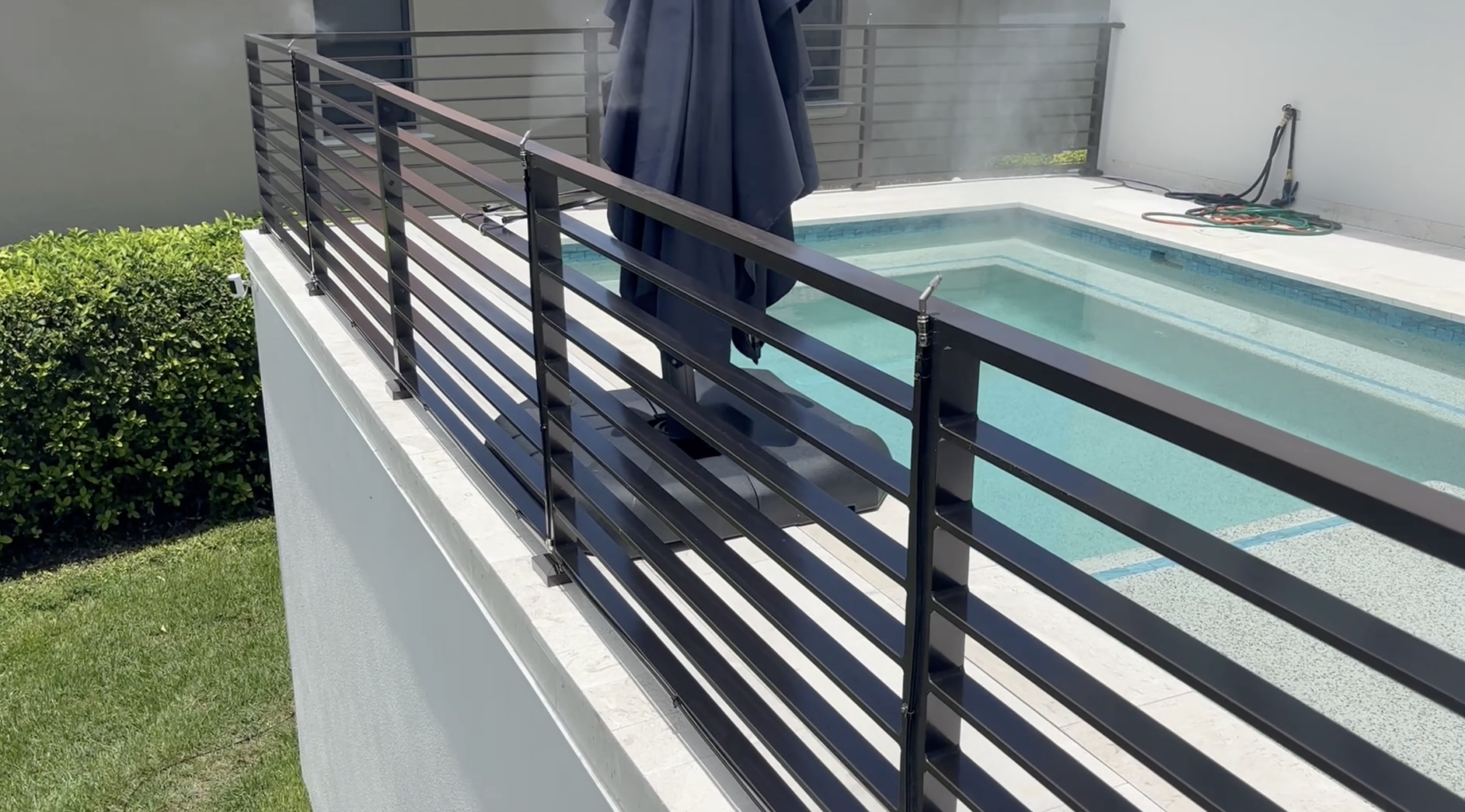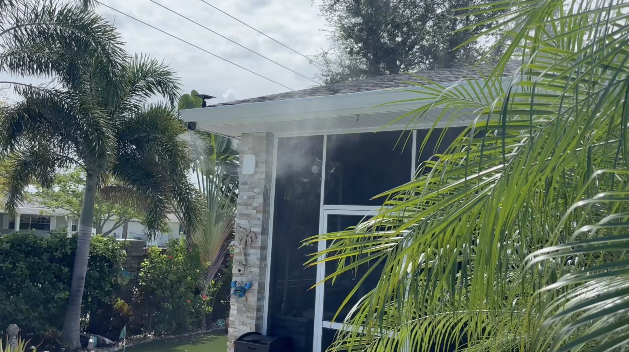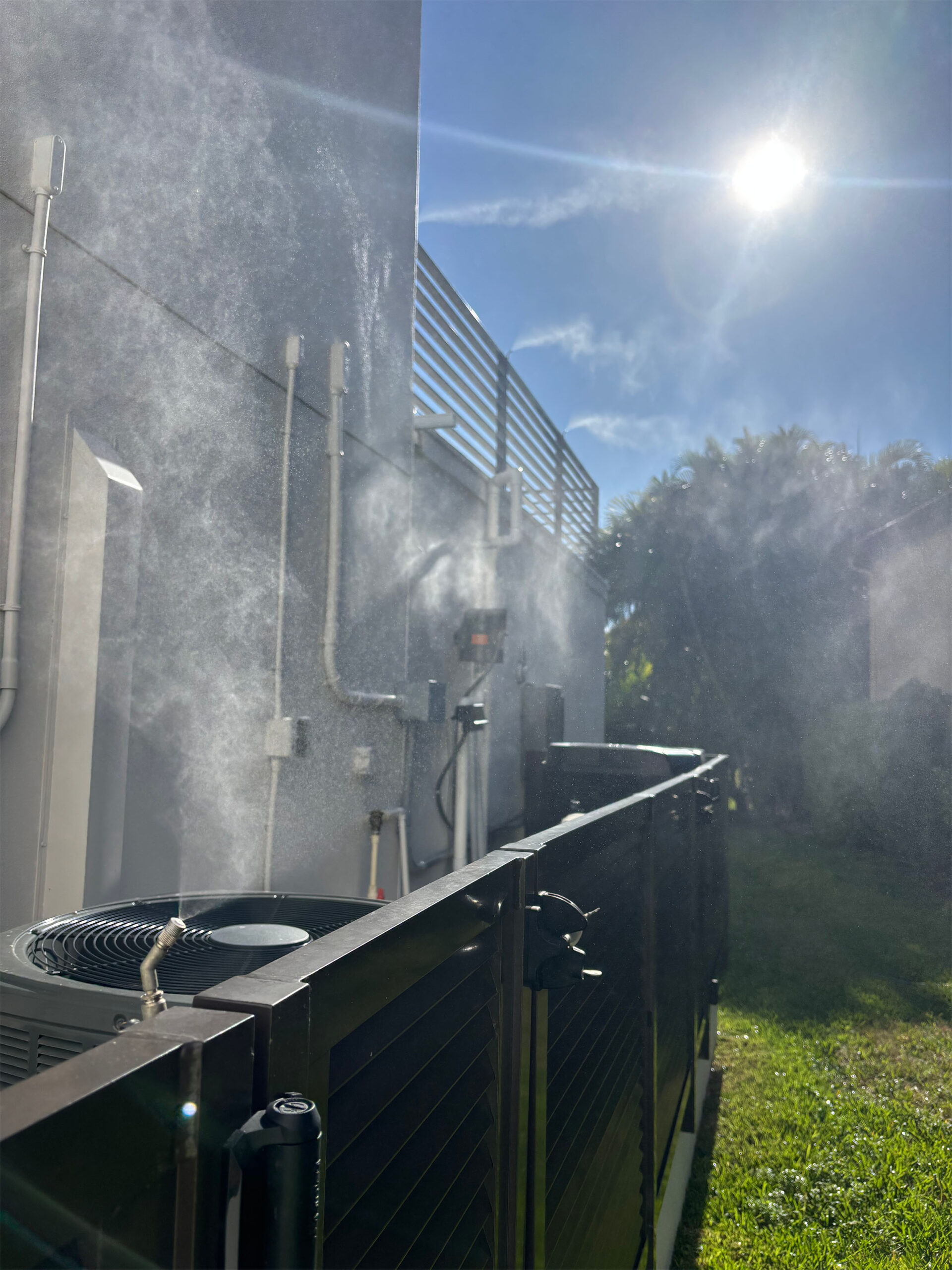 The box containing the storage tank pump and computer will be mounted in an indiscrete location around the home, out of sight and out of mind. The misting nozzles will be mounted every 9 to 10 feet along the entire fence line surrounding the entire backyard. A row will be run along the roof line between the gutter and the soffit hiding all lines with just the tips of the nozzle visible. A single line will run across the pool and deck where the roof meets the pool cage to ensure complete coverage inside the lanai area. All lines will be buried or hidden out of sight; all clamps are stainless steel with matching black or white lines and brackets to match whatever application we are putting it on.